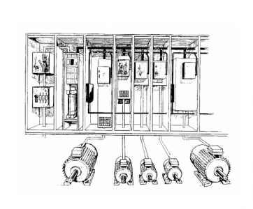 The drive has a multidrive configuration. It consists of a supply section including connection devices (main fuses and main contactor or circuit breaker), rectifier devices (a diode or thyristor bridge), capacitors for smoothing of the DC voltage, optional devices, if specified, and a number of drive sections. The power range for the supply sections is 40 – 2500 kVA and the power range for the drive sections is 9 – 2500 kVA.