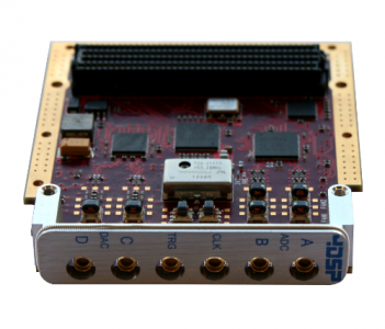 The FMC150 has a low-pin count connector, front panel I/O, and can be used in a conduction cooled environment. The design is based on TI’s ADS62P49 dual channel 14-bit 250Msps ADC and TI’s DAC3283 dual channel 16-bit 800Msps D/A. The analog signals are AC coupled connecting to MMCX or SSMC coax connectors on the front panel. The FMC150 allows flexible control on clock source, analog input gain, and offset correction through serial communication busses. Furthermore the card is equipped with power supply and temperature monitoring and offers several power-down modes to switch off unused functions, reducing system level power and heat and is well suited for software defined radio (SDR), battery or other low power source applications. This is ideal for applications such as airborne where power demand effects mission range and on-station mission time.